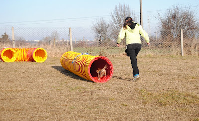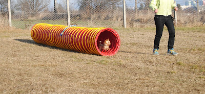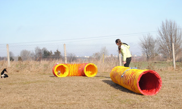 Lucky biega tunele, próbuje uczyć się slalomu, oraz oswaja się z kładką i huśtawką. A najśmieszniejsze jest to, że strefy są dla niego takie duże, a może raczej on jest tak mały w porównaniu do długości strefy, że bez problemu przez nie przedreptuje kilkakrotnie ;) (chociaż obawiam się że tylko na razie). A huśtawka (położona na ziemi na niewielkim podwyższeniu, tak by tylko trochę była ruchoma) z wielką trudnością się przeważa, jak te rozpędzone dwa kilo psa na nią wbiegnie ;) Ja się uczę natomiast ogólnego ogarnięcia, zmian itp, a przy tym ciągle boję się że pies zamiast wbiec w tunel przeleci obok (co miało miejsce), i ja go wtedy rozdepczę (co na szczęście się nie zdarzyło).