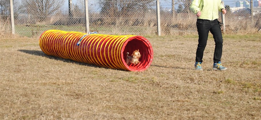 Pracuje nam się bardzo fajnie, jedyne co mnie najbardziej denerwuje to "wyłączanie się" psa od czasu do czasu, a wygląda to tak że Lucky biegnie biegnie tunel, zgarnia smaczka/piłeczkę w nagrodę, po czym radośnie biegnie na drugi koniec placu, z nosem przy ziemi, bo wyczuł tam cudze smaczki. I węszy, węszy, i szuka... A takie znalezione, czyjeś żarcie jest ogromną pokusą i czymś tak pysznym, że moje motywatory w saszetce nie mają szans. Czyjeś zawsze lepsze... A wyniuchane na ziemi smaczki które są za free bo nie trzeba biegać, myśleć, gimnastykować się i wykonywać komend aby je zdobyć są jeszcze fajniejsze. Na szczęście do innych psów mi nie zwiewa (chyba że do ich właścicieli, którzy mają smaczki!). Poza tymi drobnymi szczegółami radzi sobie jak na yorka całkiem dobrze i mimo wszystko jestem z niego dumna. :)